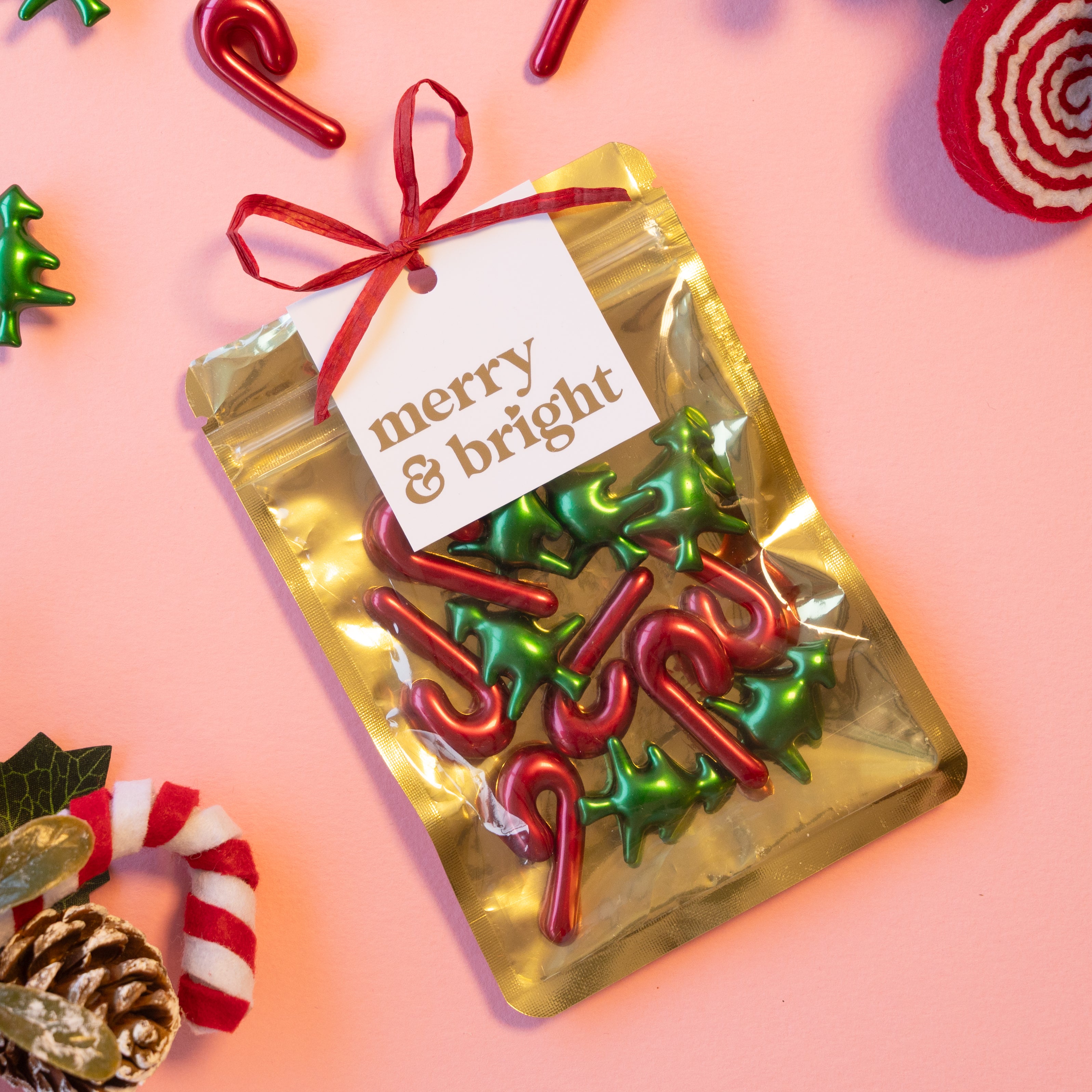 Treat yourself to a luxurious, calming experience with our Merry & Bright Christmas Bath Pearls. This 12-pack of candy cane and Christmas tree bath pearls is delicately tied with red raffia and presented in a beautiful gold pouch with gold foil Merry & Bright tag, making it the perfect festive gift or personal indulgence. Each pearl is infused with the soothing strawberry or eucalyptus scent, to help you unwind and de-stress.