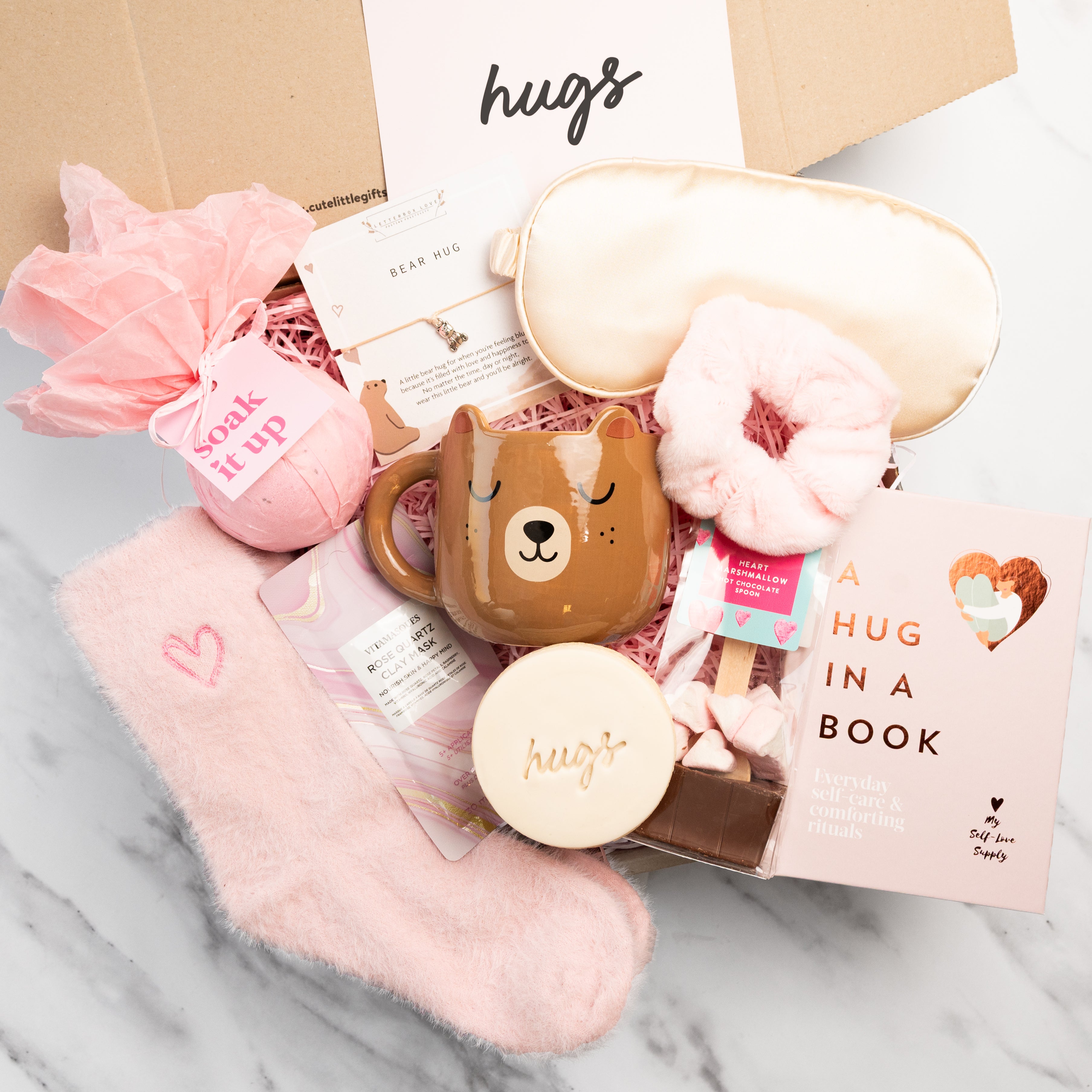 Send a cosy hug in a box with this heart-warming Bear Hugs Parcel Gift. Designed to bring comfort and cheer, this thoughtful gift is packed with treats to soothe, relax and uplift. At its heart is a charming bear mug, perfect for enjoying a warm drink, and a delicate bear hug bracelet, a keepsake to remind them they’re loved.