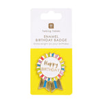 Shaped like a classic rosette, the badge features vibrant, multi-coloured stripes that radiate fun and festivity. The centre proudly displays the words ‘Happy Birthday’, making it a cheerful statement piece that’s impossible to miss. Its eye-catching design adds a whimsical touch to jackets, bags, or hats, allowing the wearer to show off their birthday pride or spread happiness to a friend or family member.