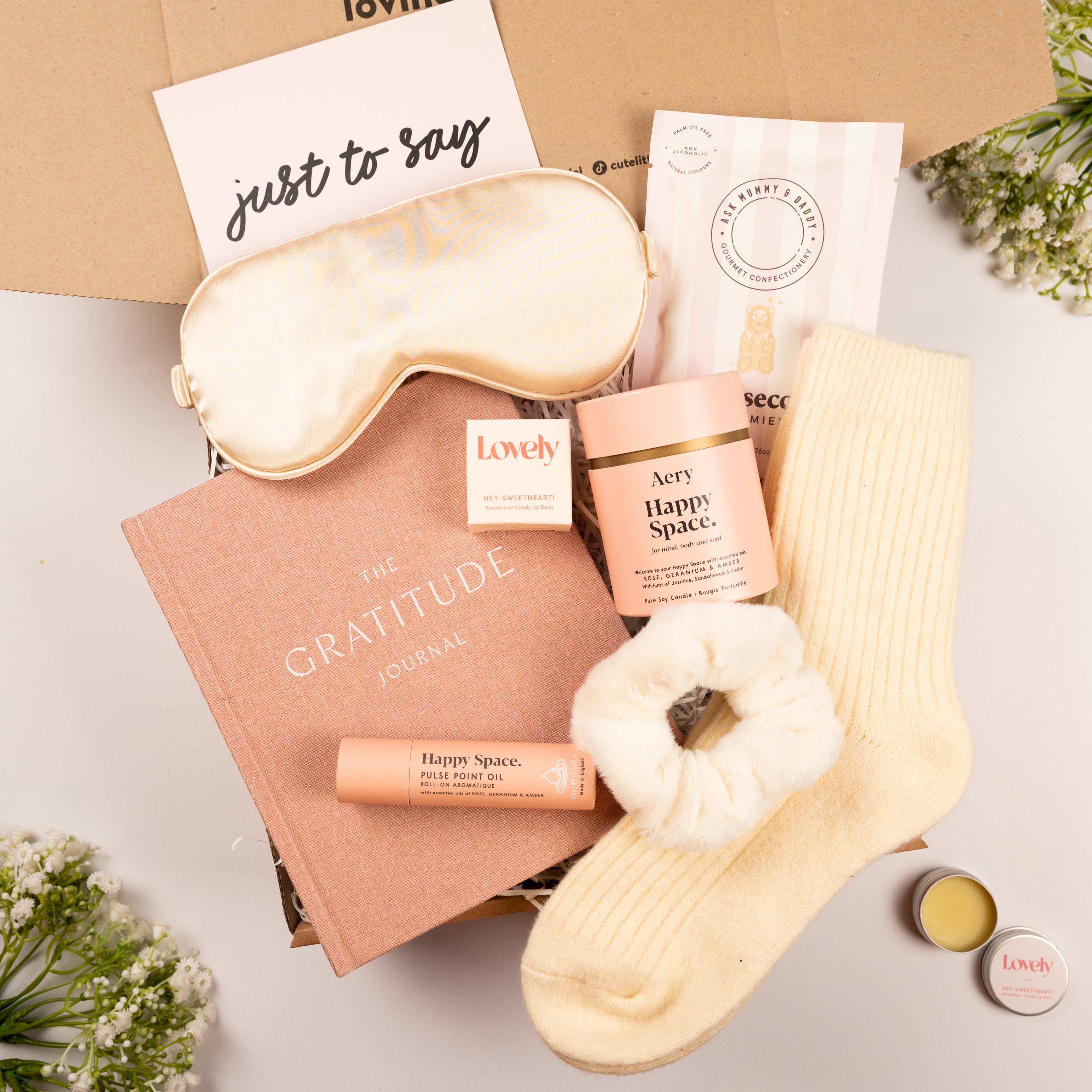 To support rest and relaxation, the parcel includes a silky sleep mask for peaceful evenings and an Aery Happy Space candle paired with a matching pulse point oil. Together, they help create a calming, uplifting atmosphere that’s ideal for winding down or building a comforting daily ritual.