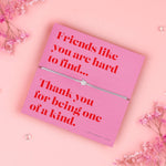 Show your appreciation for a special friend with this beautiful Friendship Sentiments Wish Bracelet. Featuring a heartfelt message, "Friends like you are hard to find, thank you for being one of a kind," this thoughtful gift expresses your gratitude. The bracelet is adjustable to fit most wrists, making it a versatile and meaningful present for any occasion.